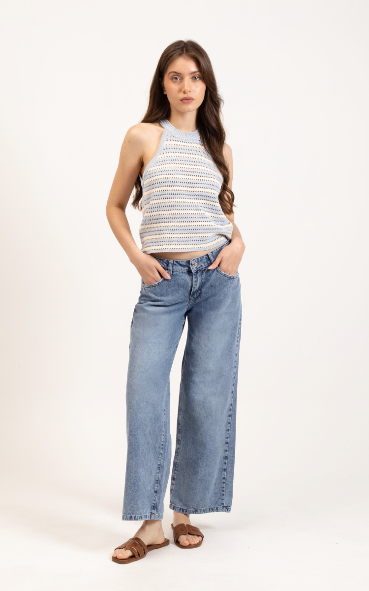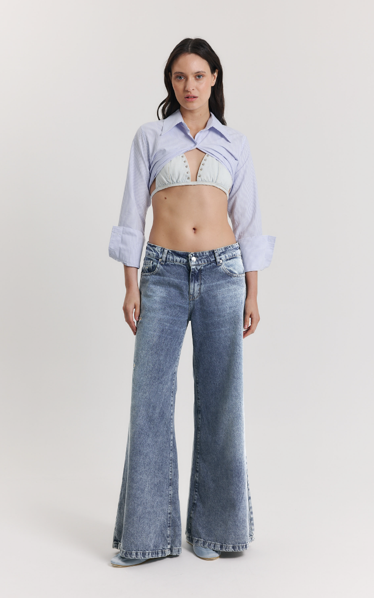 1781 / WIDE LEG DENIM RIGIDO EFECTO LAVADO CON MICROROTURAS TIRO ALTO TALLES 36 AL 44 INQUIETA