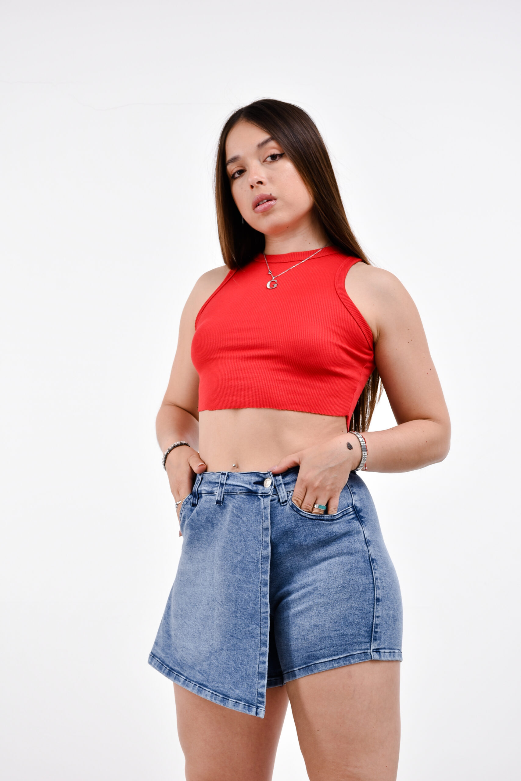 ART. MISSY | SHORT POLLERA CLASICO AZUL CON SOLAPA ELASTIZADO TIRO ALTO TALLES 38B AL 52 RUMAJU