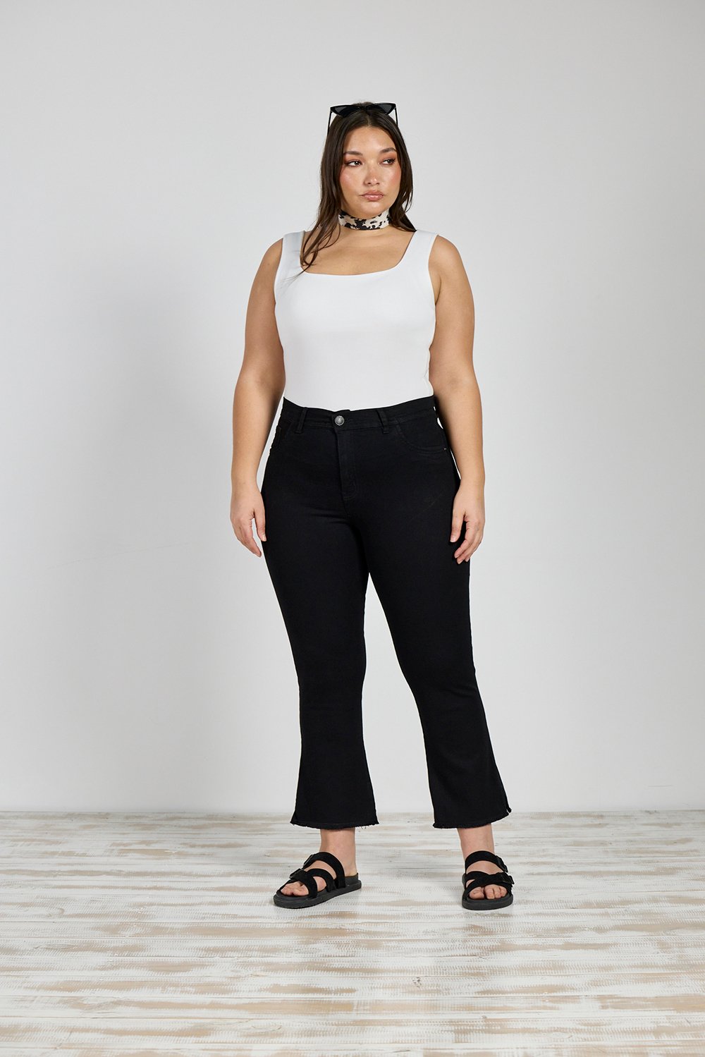 2317-JEAN PLUS SIZE CROP NEGRO ELASTIZADO DESFLECADO TIRO ALTO INQUIETA 44-54