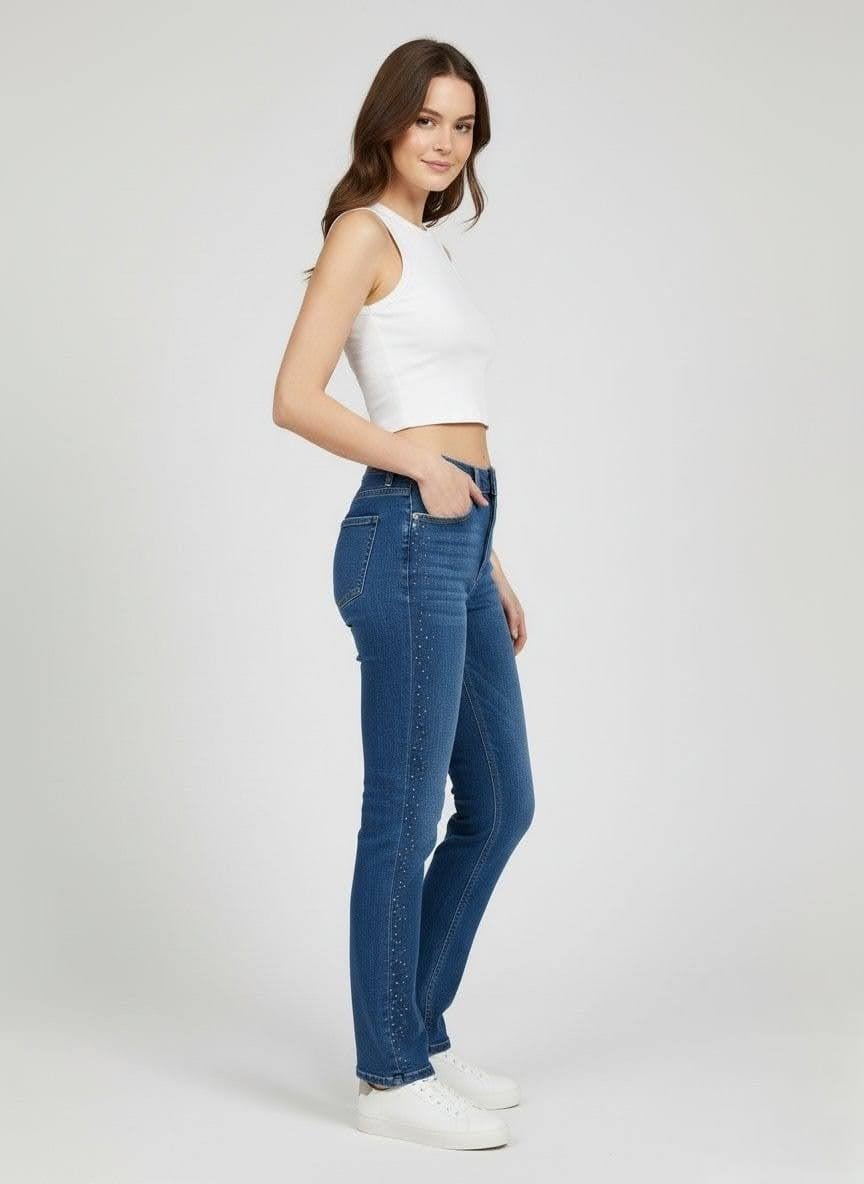 FRANCIS | PANTALON JEAN RECTO AZUL ELASTIZADO CON BRILLO LATERAL TALLES 38 AL 54 TORINE