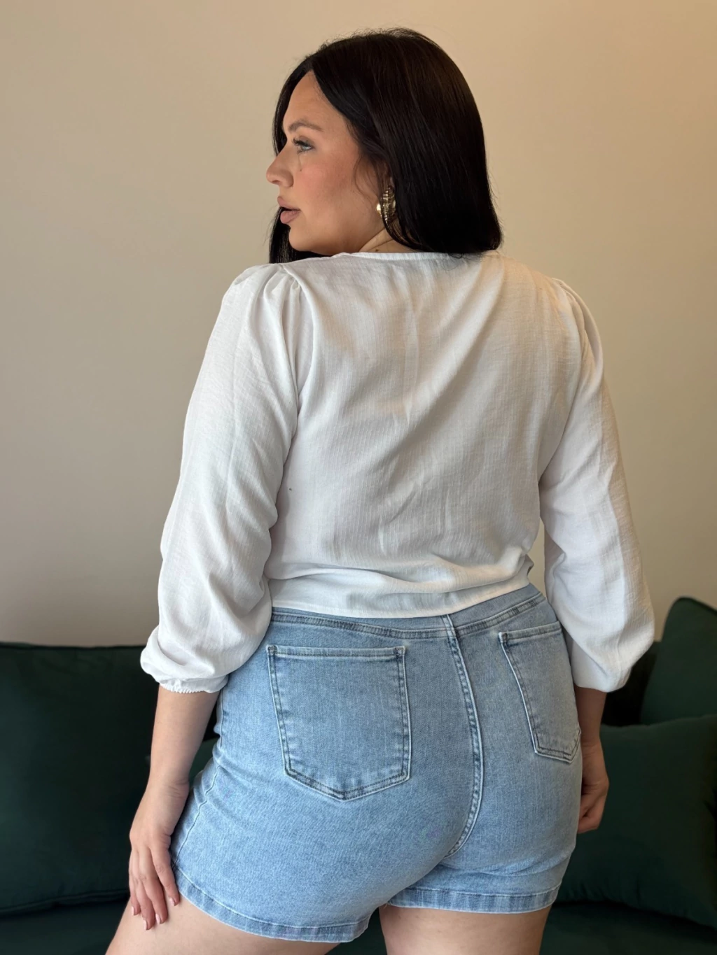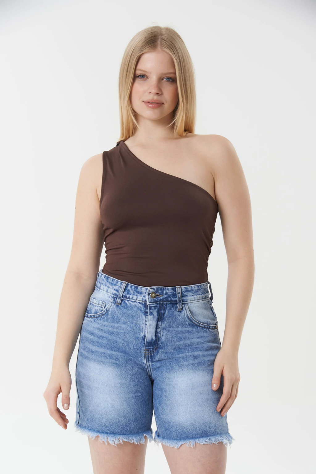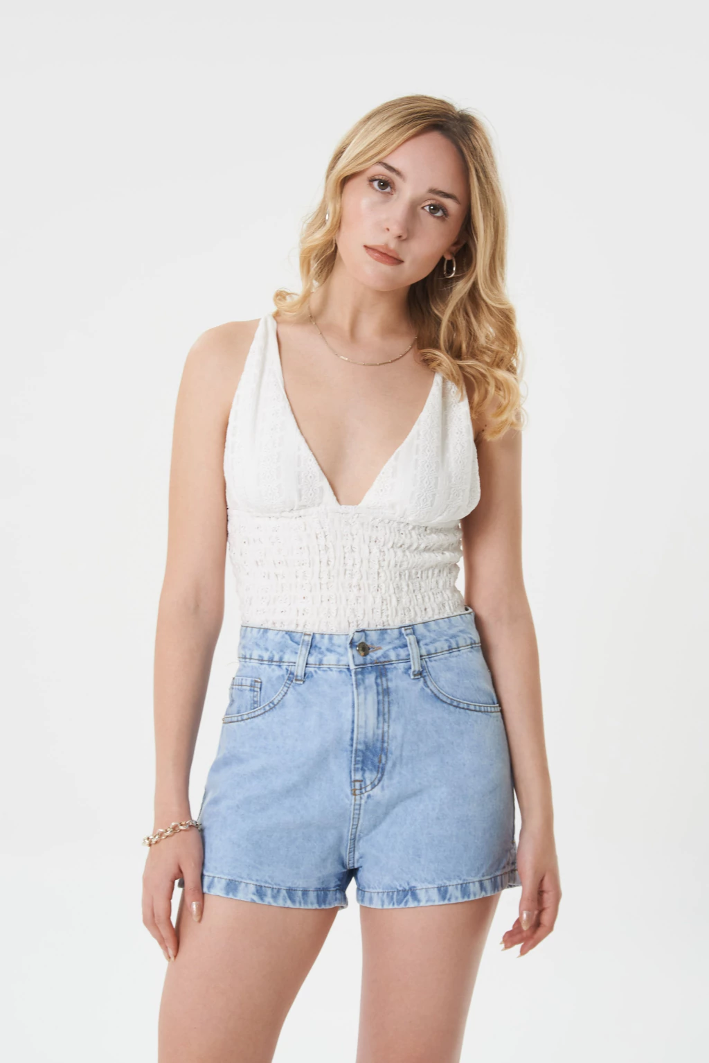 SAUDE-SHORT CELESTE ELASTIZADO CON STRASS RUEDO CORTADO TIRO ALTO TALLES 36 AL 46 STRIVEN