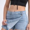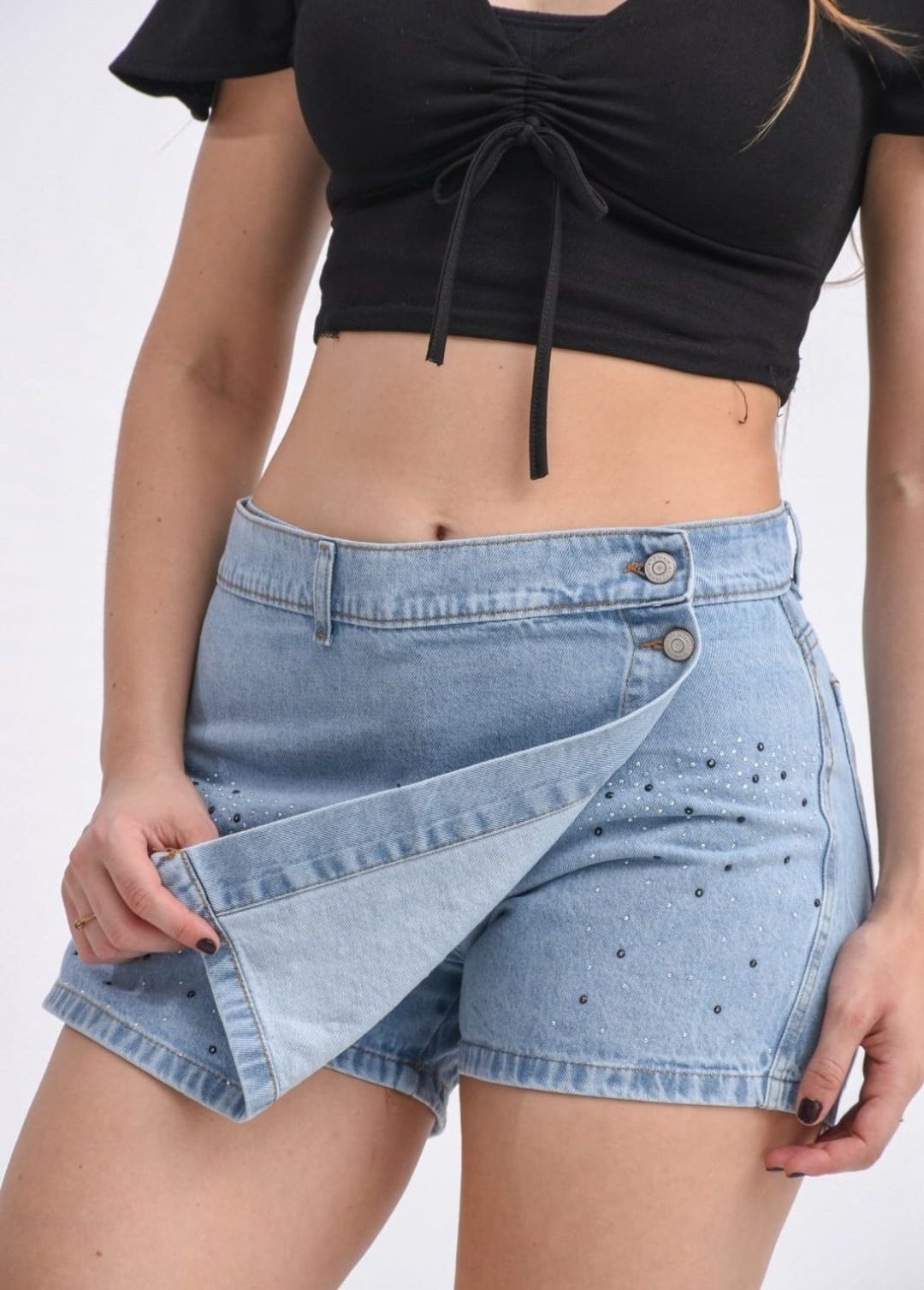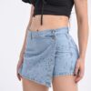 033BR I SHORT POLLERA DE JEAN CON SOLAPA FRONTAL Y STRASS TIRO ALTO TALLES 36 AL 46 EXITO JEANS