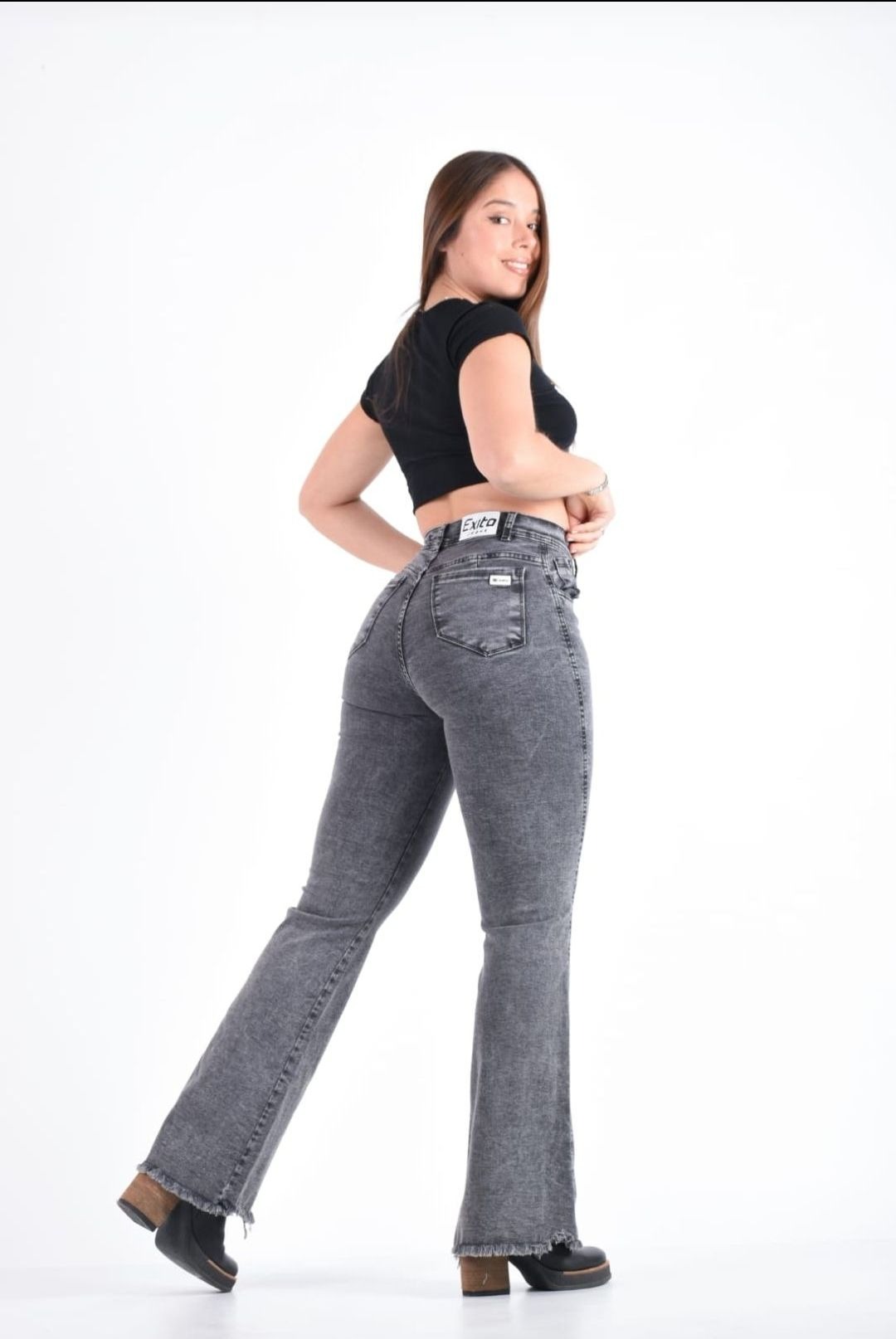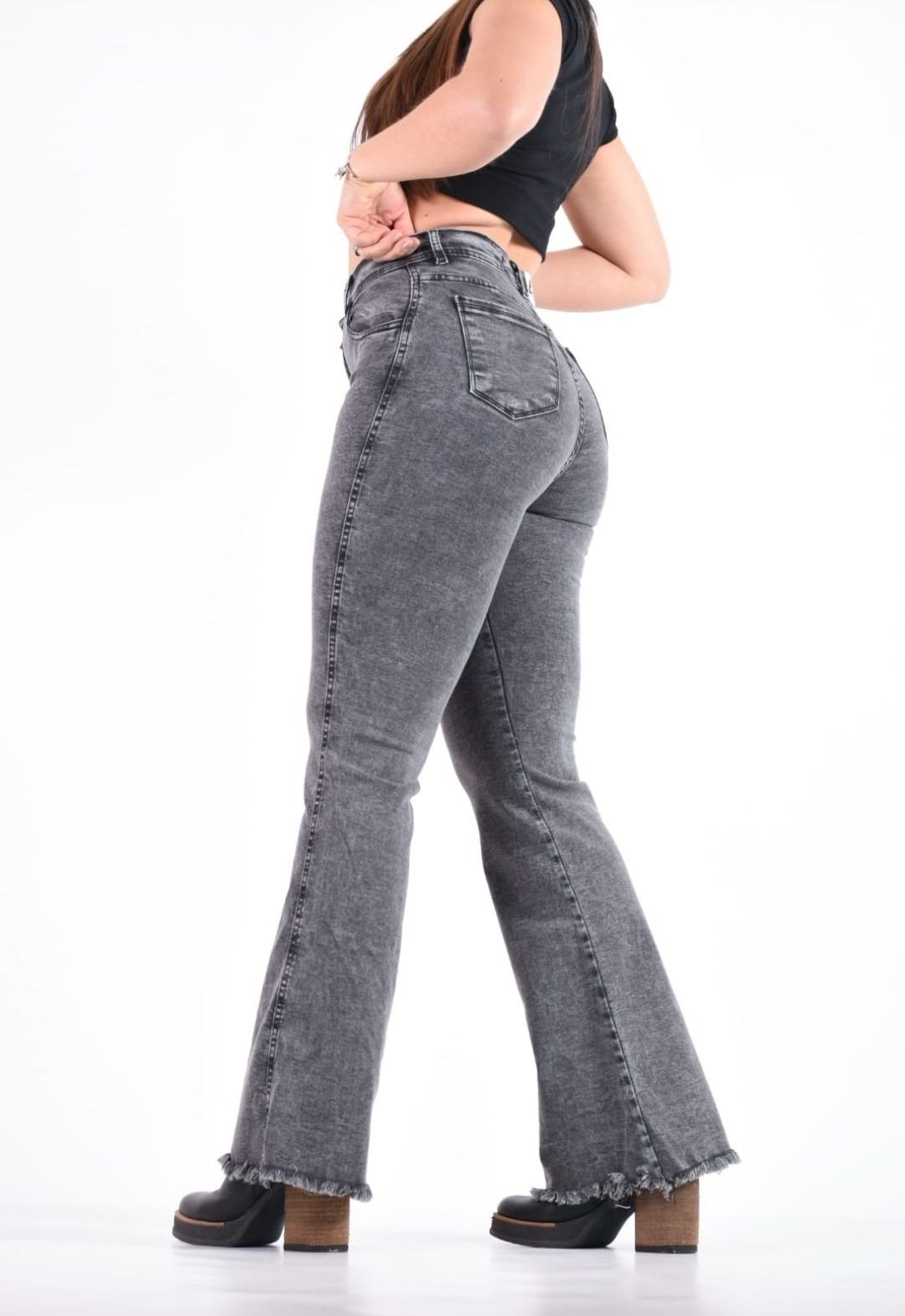 303NEV I JEAN PALAZZO GRIS DESGASTADO CON DESFLECADO EN BOTA TIRO ALTO TALLES 36 AL 50 EXITO JEANS