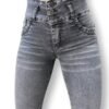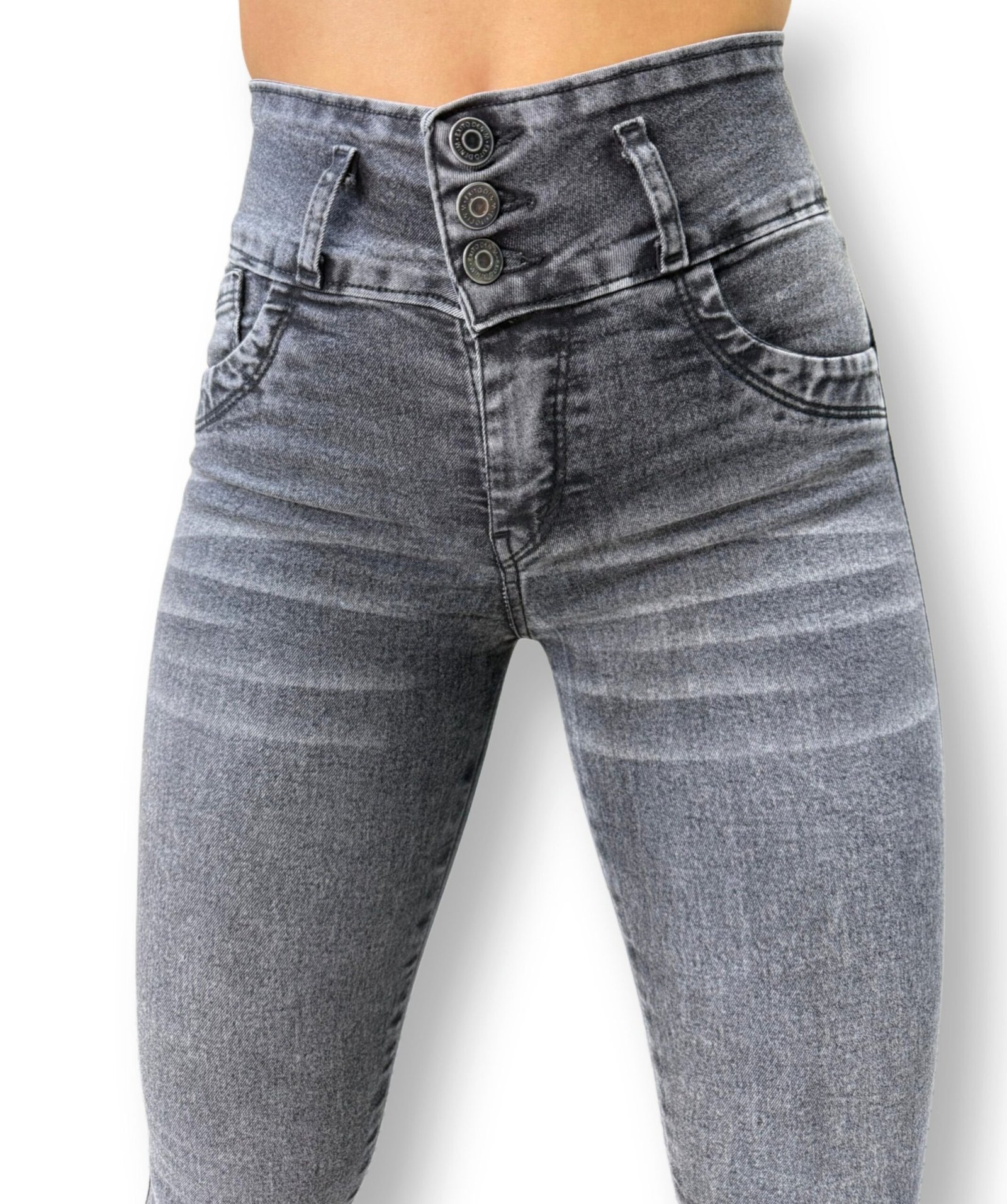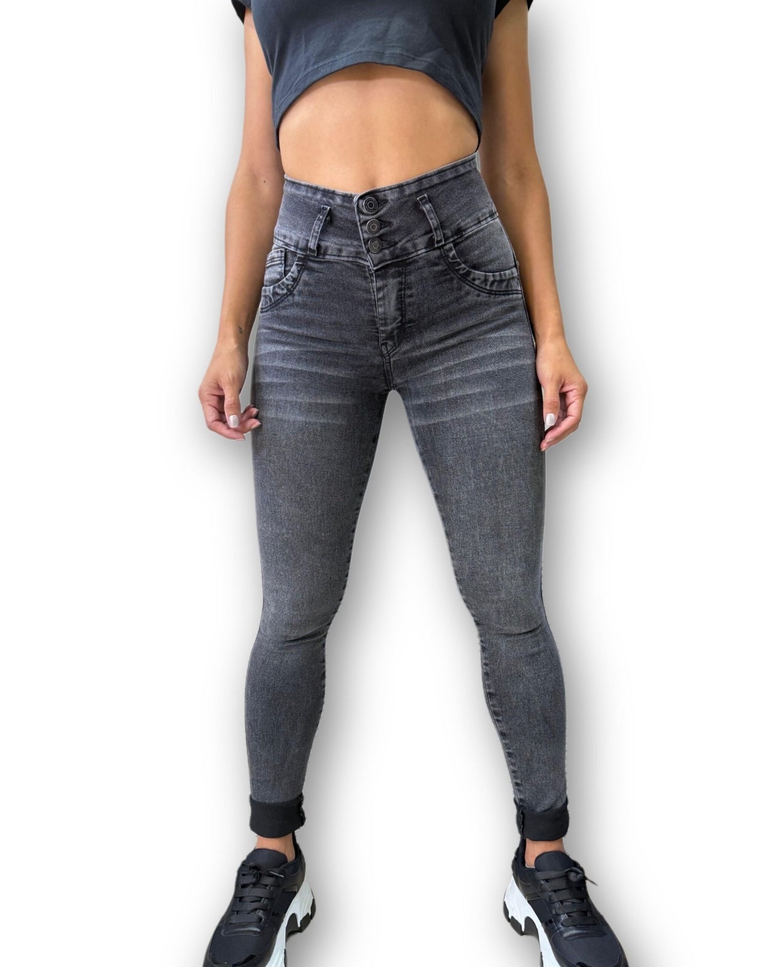 504 | JEAN SKINNY ELASTIZADO GRIS CON FAJA Y BIGOTES TIRO ALTO TALLES 36 AL 50 EXITO JEANS