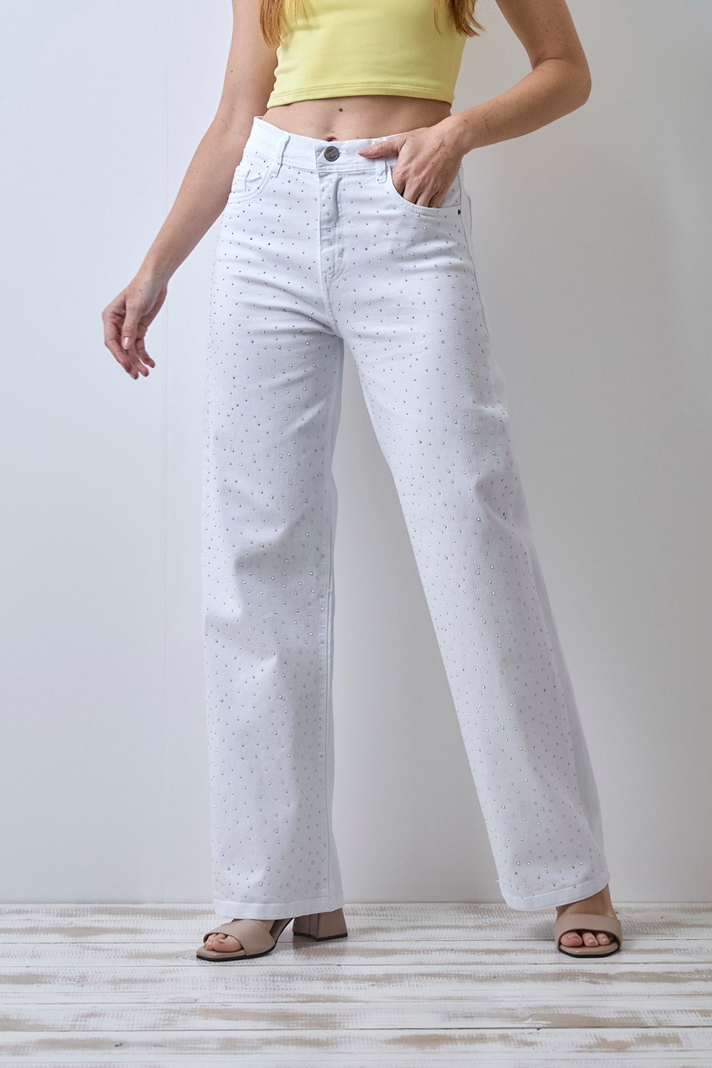 ART. 457 | WIDE LEG BLANCO CON BRILLO STRASS ELASTIZADO TIRO ALTO TALLES 36 AL 46 CENITHO