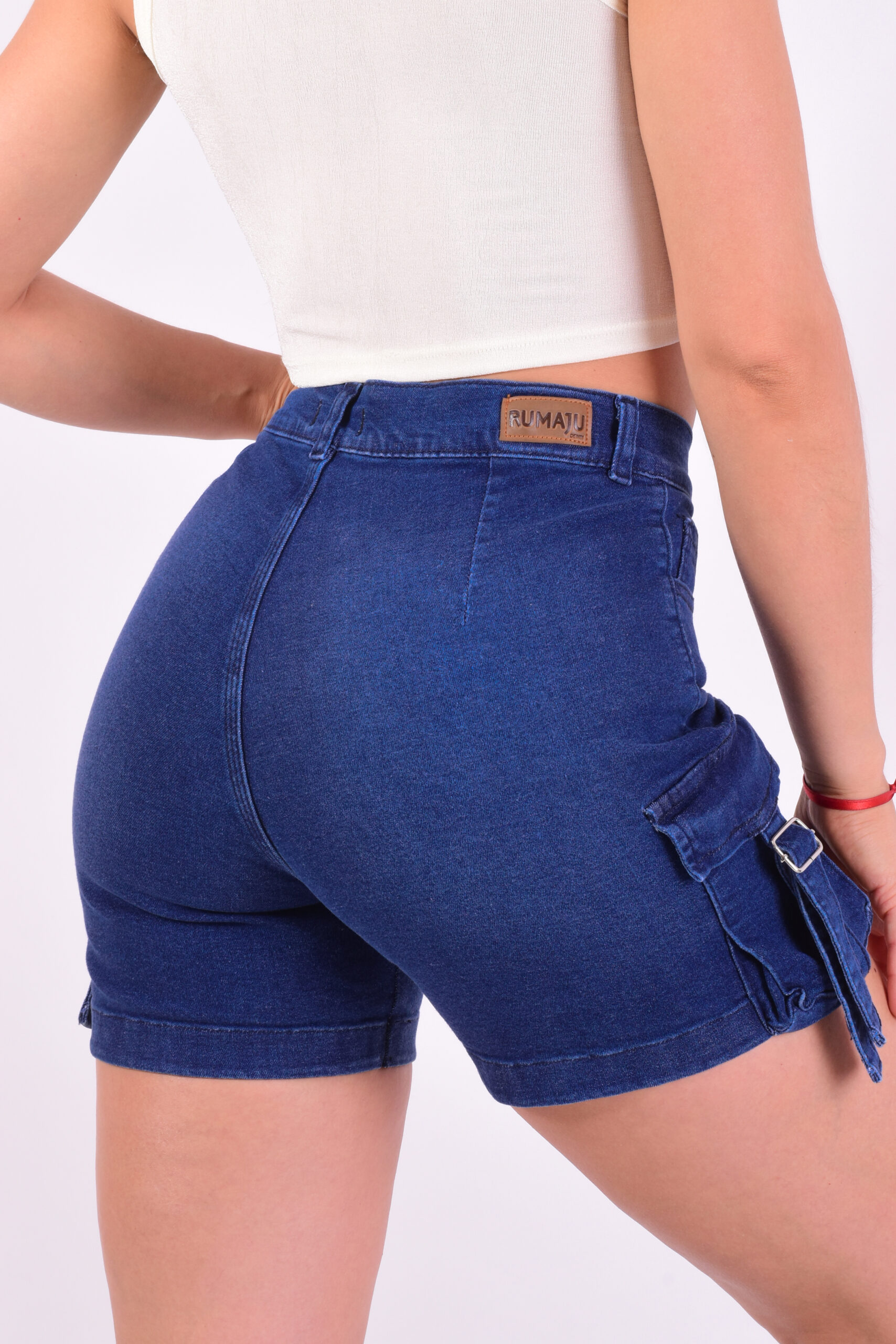 ART. BERLIN | SHORT CARGO AZUL ELASTIZADO CON BOLSILLOS FUNCIONALES TIRO ALTO TALLES 38 AL 52 RUMAJU