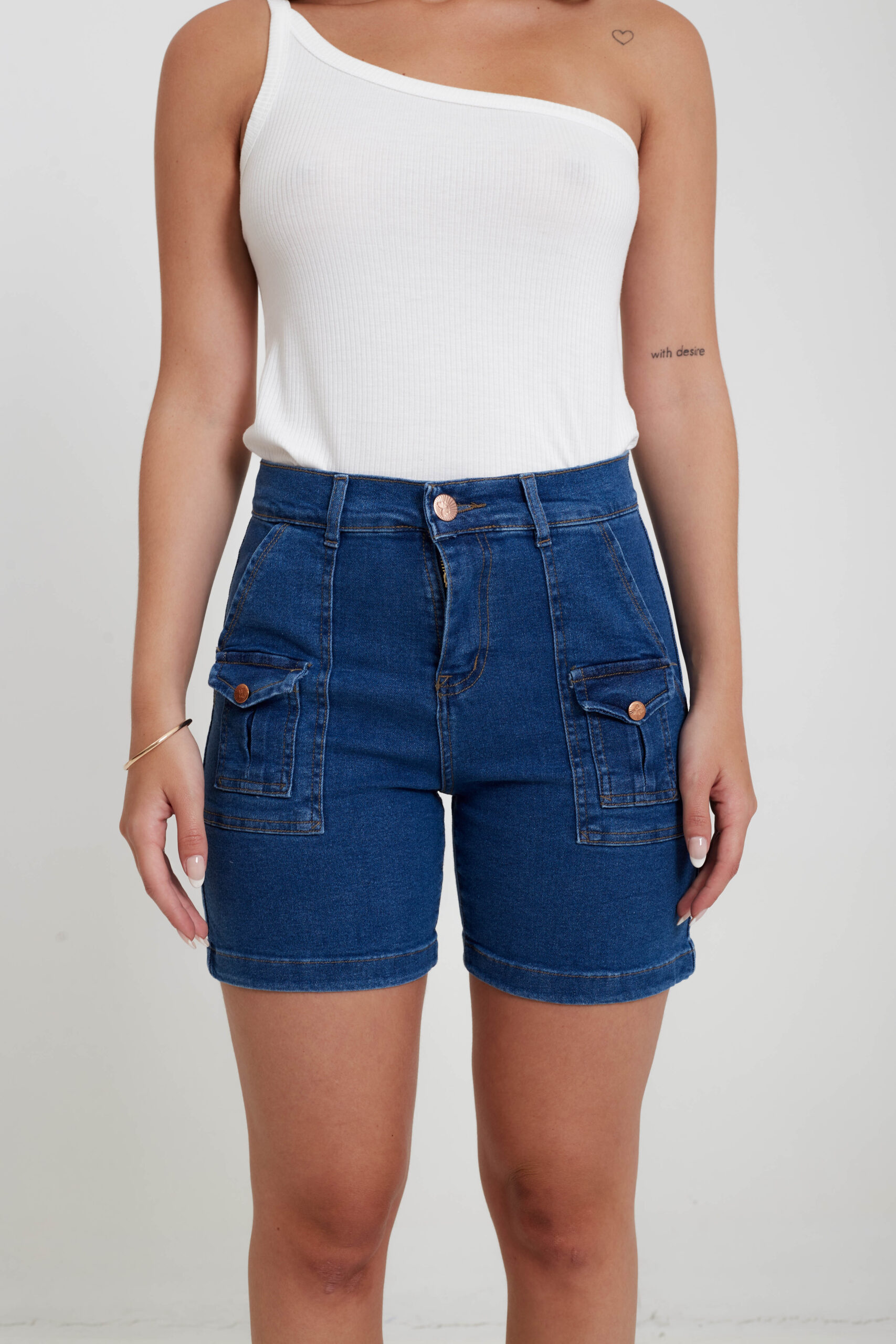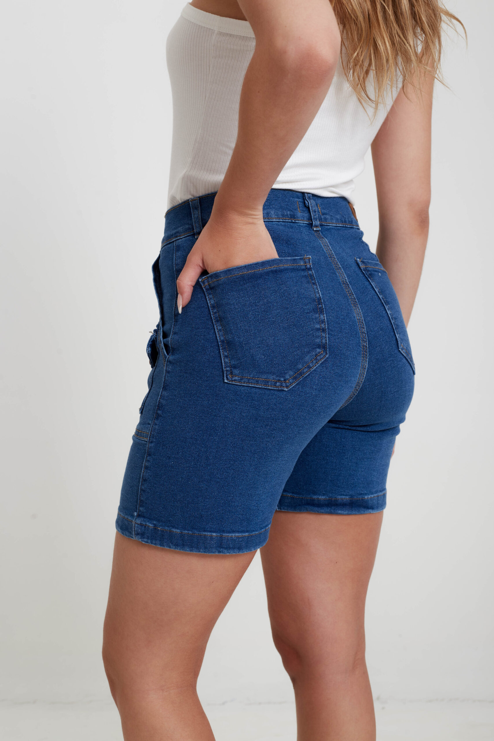 ART. EMILIA | SHORT CARGO AZUL ELASTIZADO BOLSILLOS FUNCIONALES TIRO ALTO TALLES 38 AL 52 RUMAJU