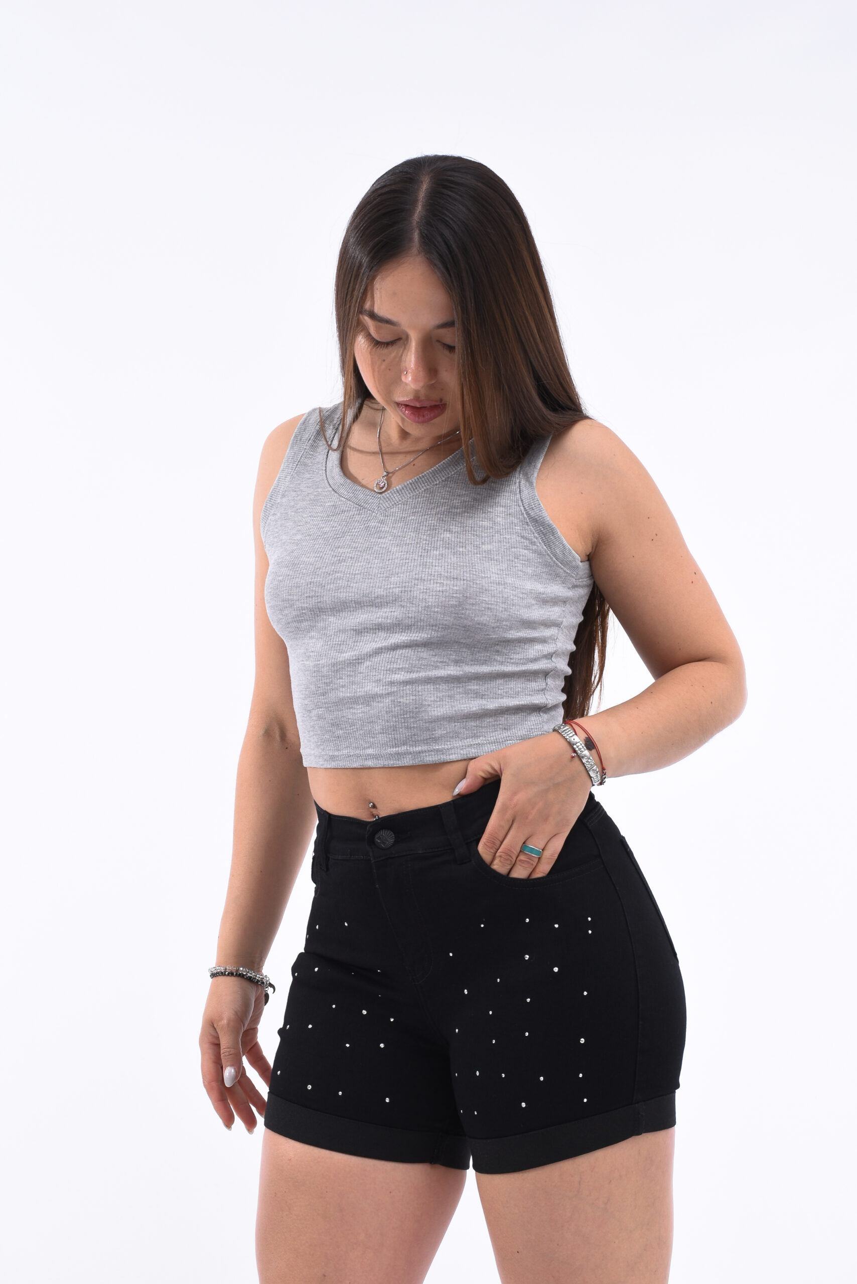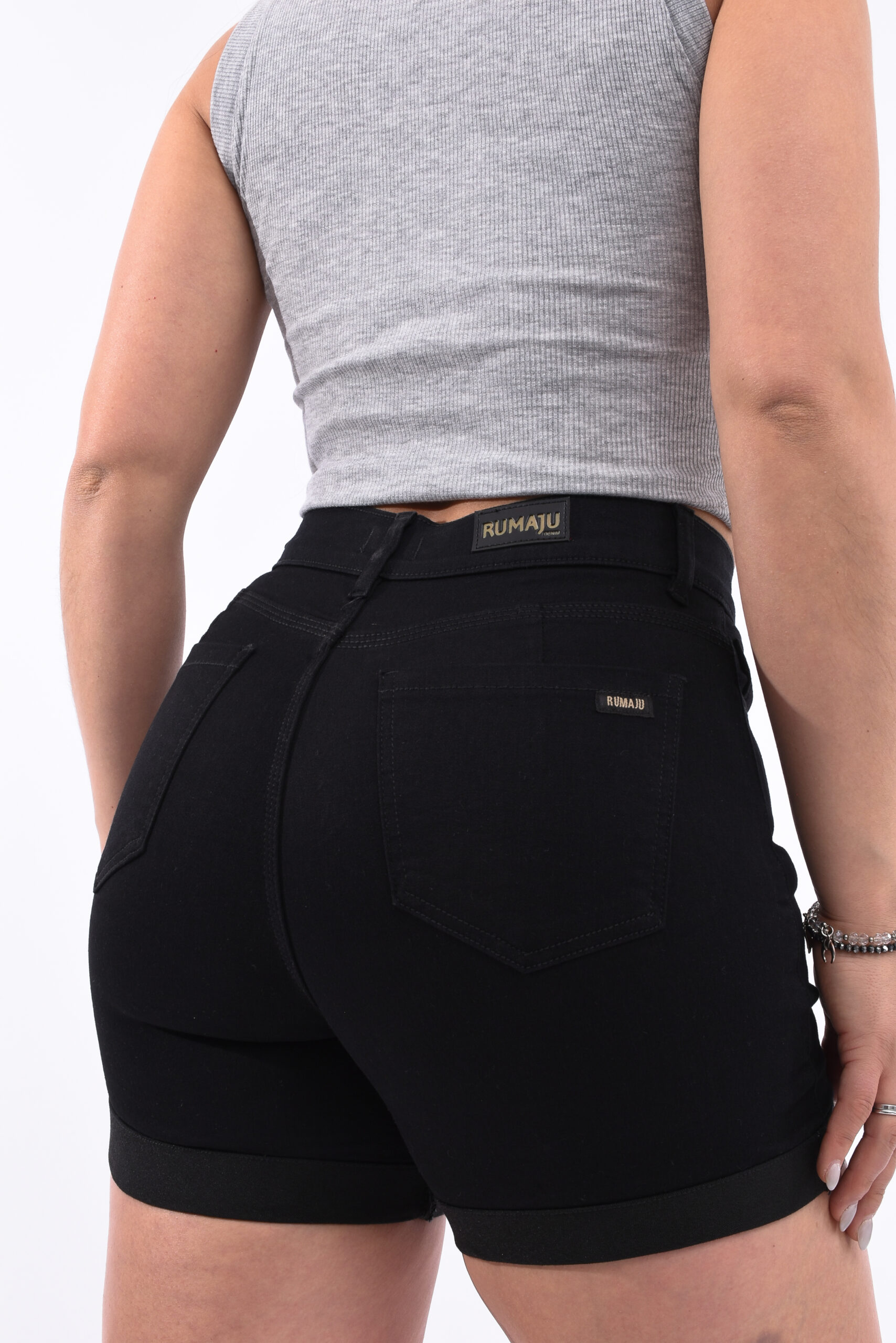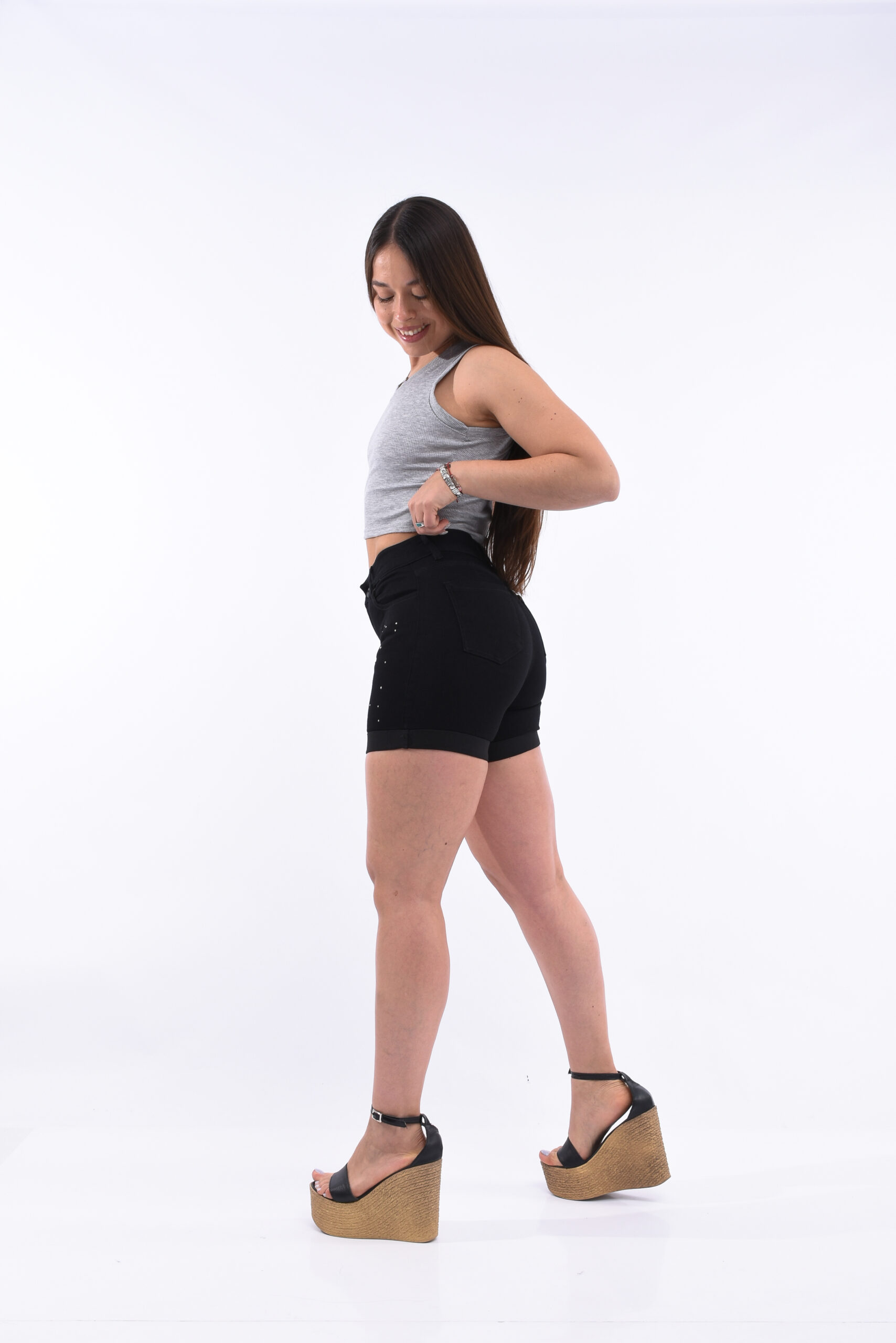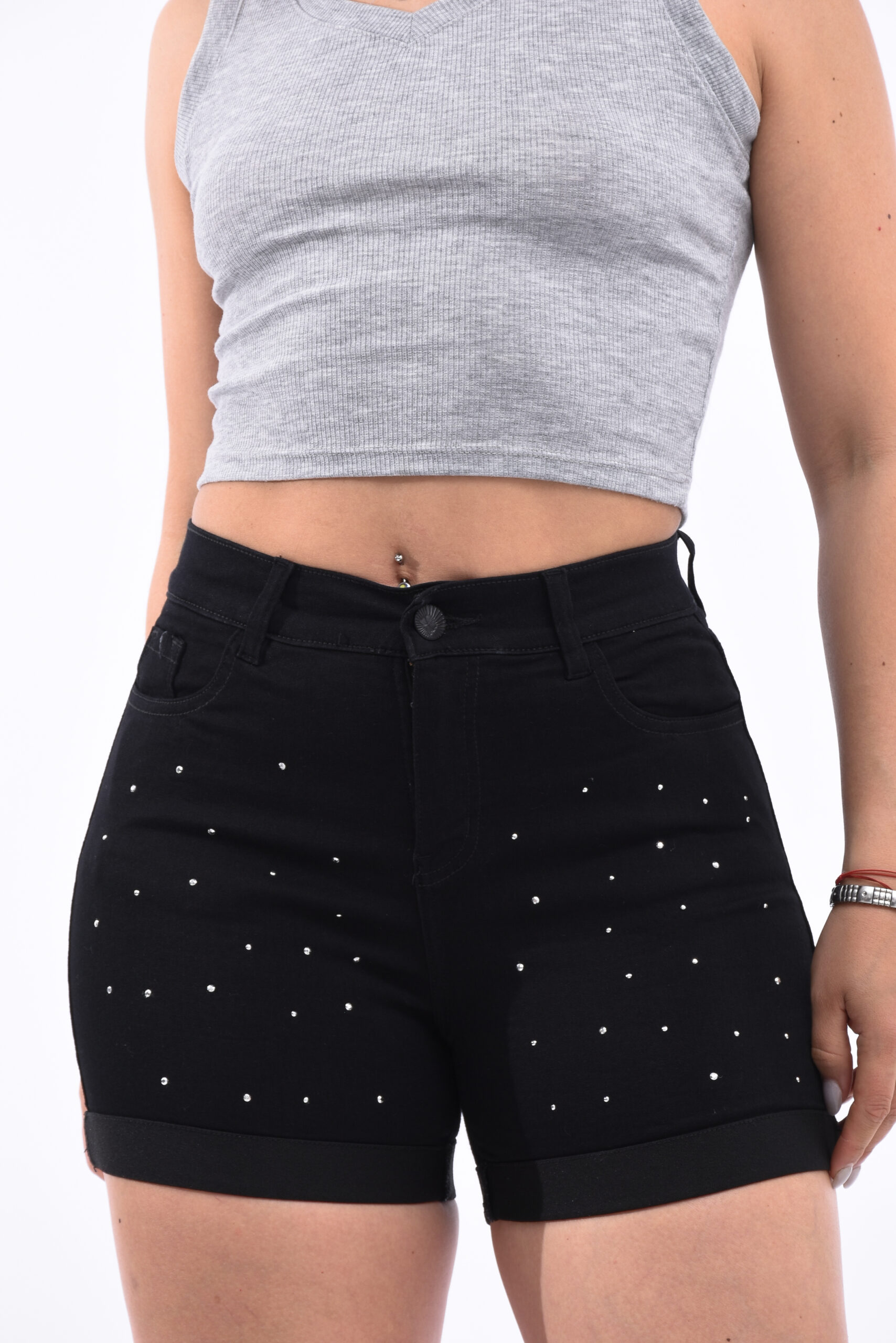 ART. VALERIA | SHORT CLASICO NEGRO CON BRILLO STRASS ELASTIZADO Y DOBLES TIRO ALTO TALLES 38 AL 54 RUMAJU