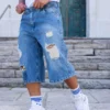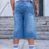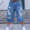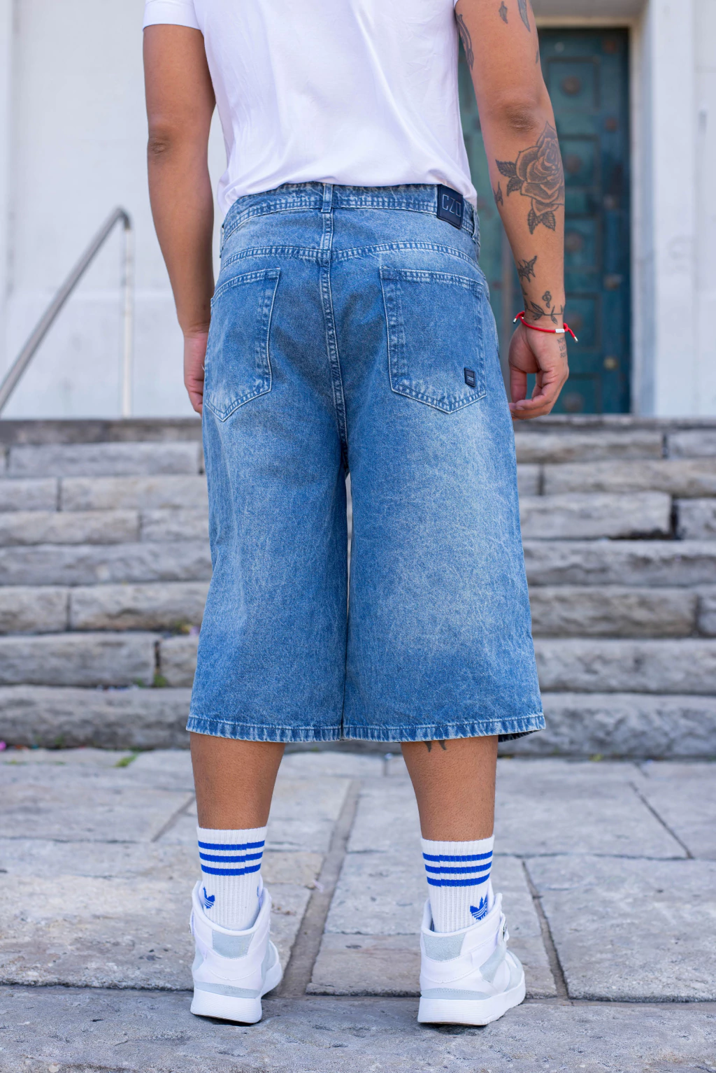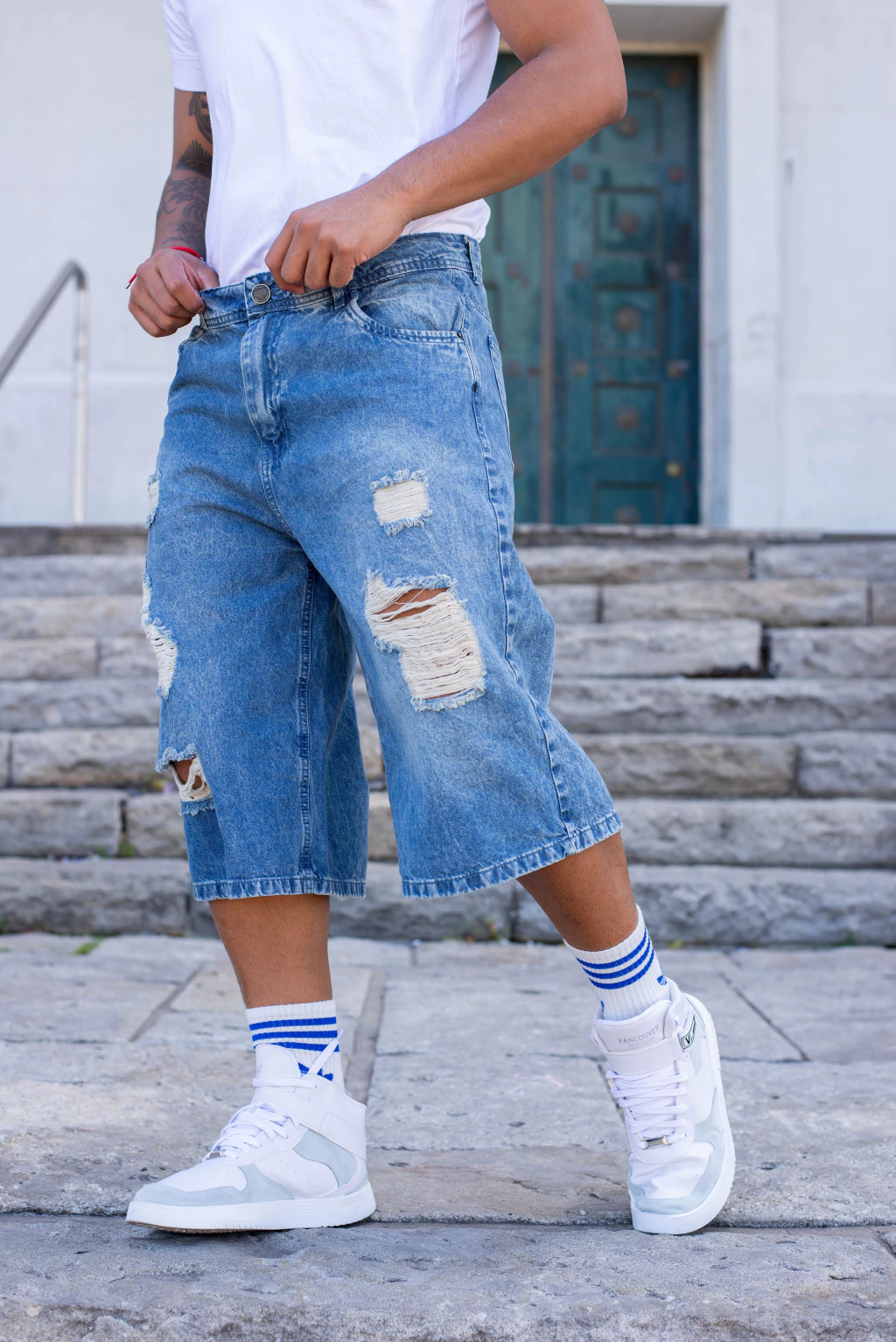 HAITI I BERMUDA BAGGY DE JEAN RIGIDO CELESTE CON EFECTO NUBE Y ROTURAS FRONTALES TALLES 38 AL 48 CRUZO