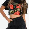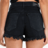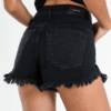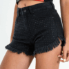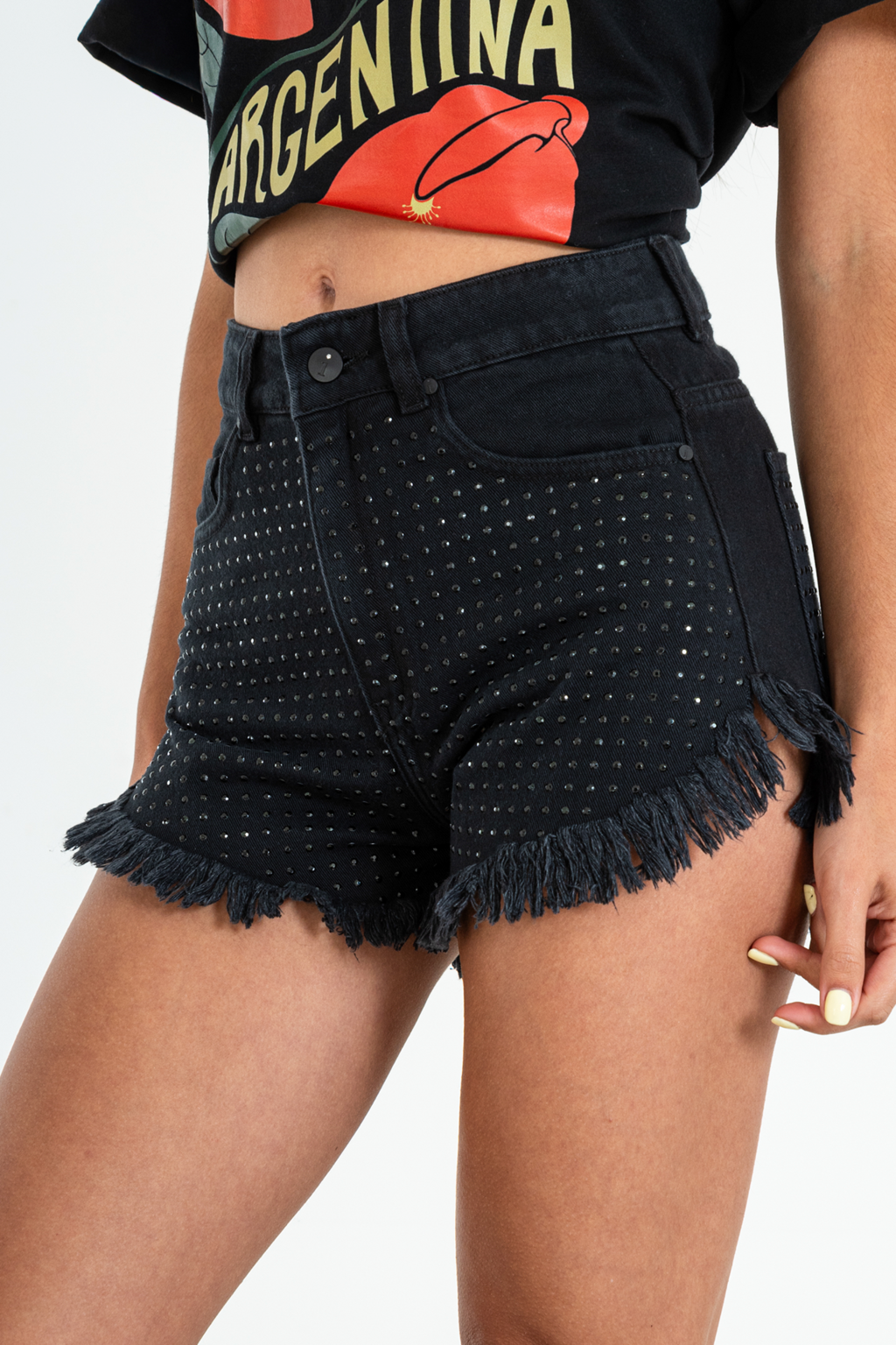 HB TULUMI-SHORT NEGRO RIGIDO CON HOTFIX STRASS DESFLECADO EN BOTA TIRO ALTO TALLES 34 AL 44 ISOSTASIA
