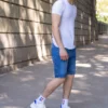 IBIZA I BERMUDA CARPINTERO DE JEAN ELASTIZADO AZUL LAVADO CON BIGOTES TALLE 38 AL 50 CRUZO