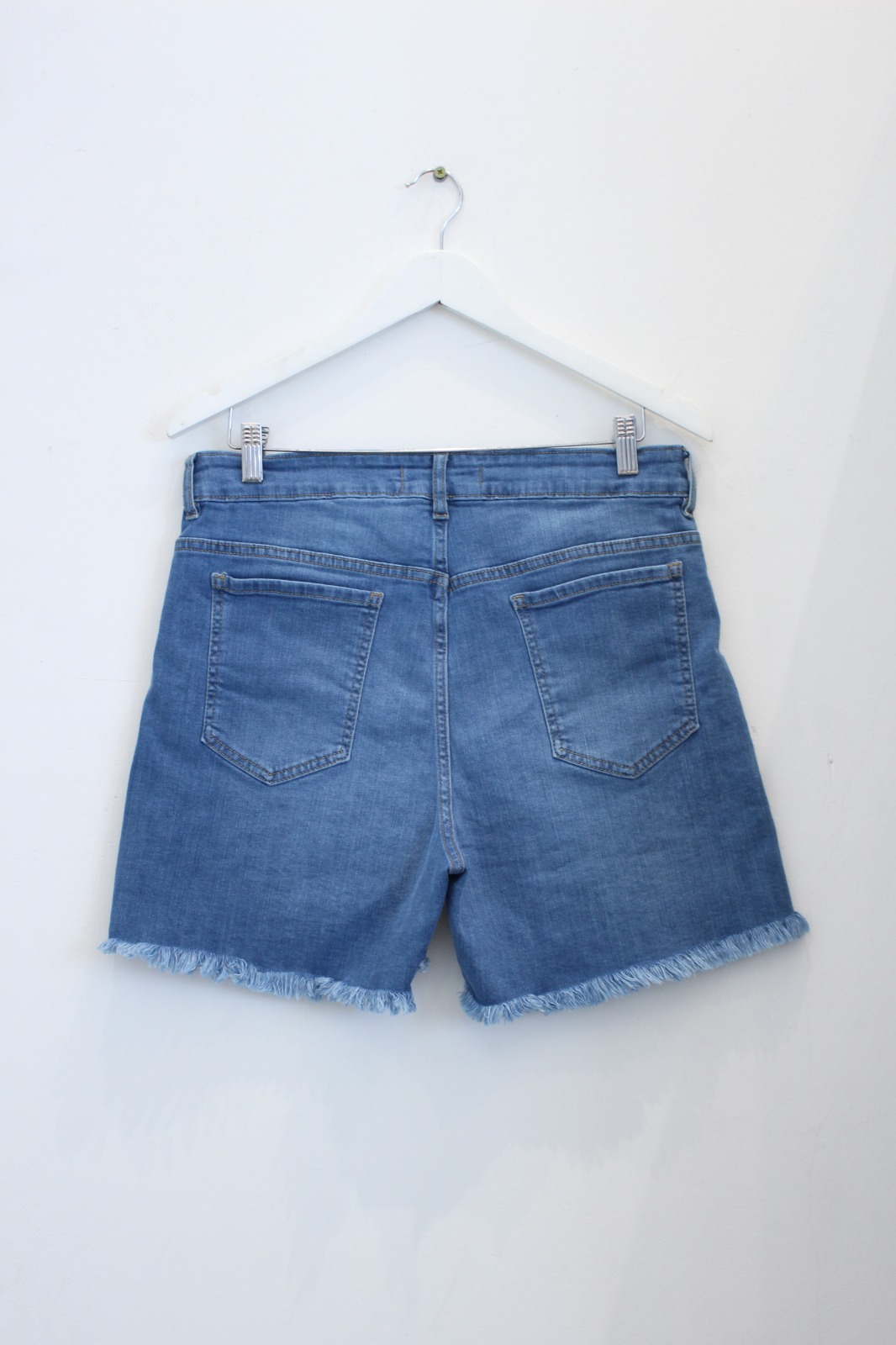 LOLA / SHORT AZUL ELASTIZADO CON BIGOTES DESFLECADO TIRO ALTO TALLES 40 AL 54 DEKA