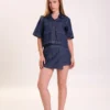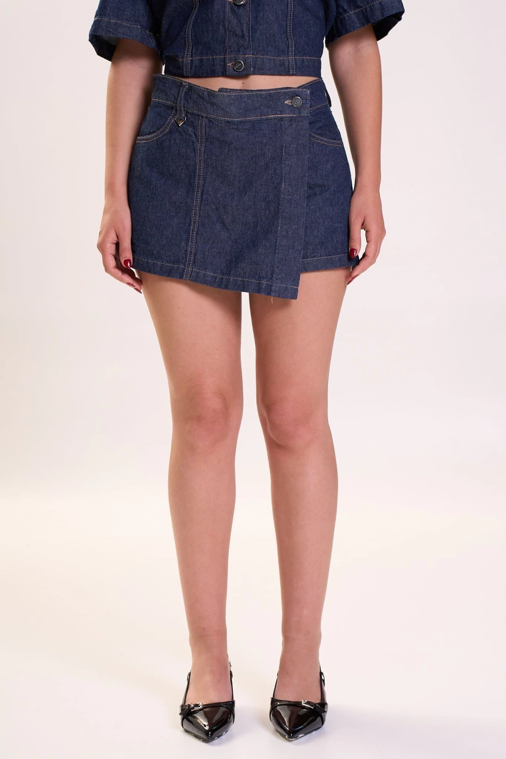 OREN- SHORT POLLERA DENIM AZUL RIGIDA BORDADO SOLAPA TIRO ALTO TALLES 38 AL 48 STRIVEN