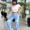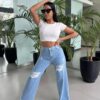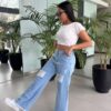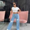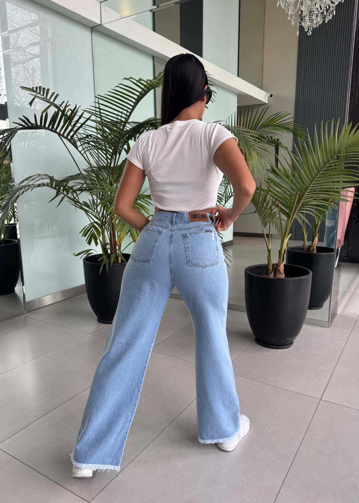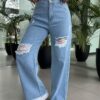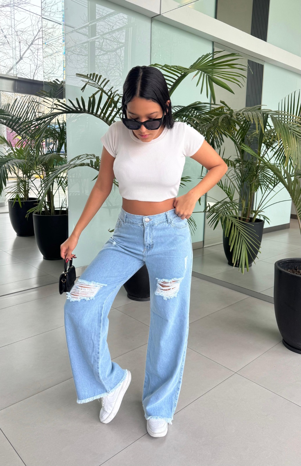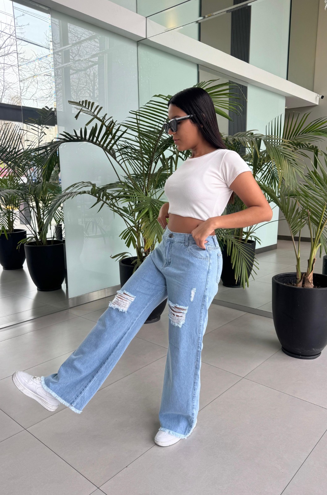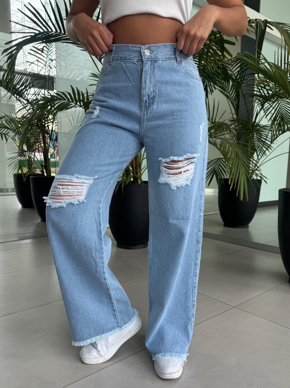 URBAN I WIDE LEG CELESTE RIGIDO CON ROTURAS Y DESFLECADO EN BOTA TIRO ALTO TALLES 36 AL 54 ANA CLARA