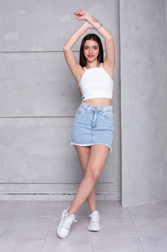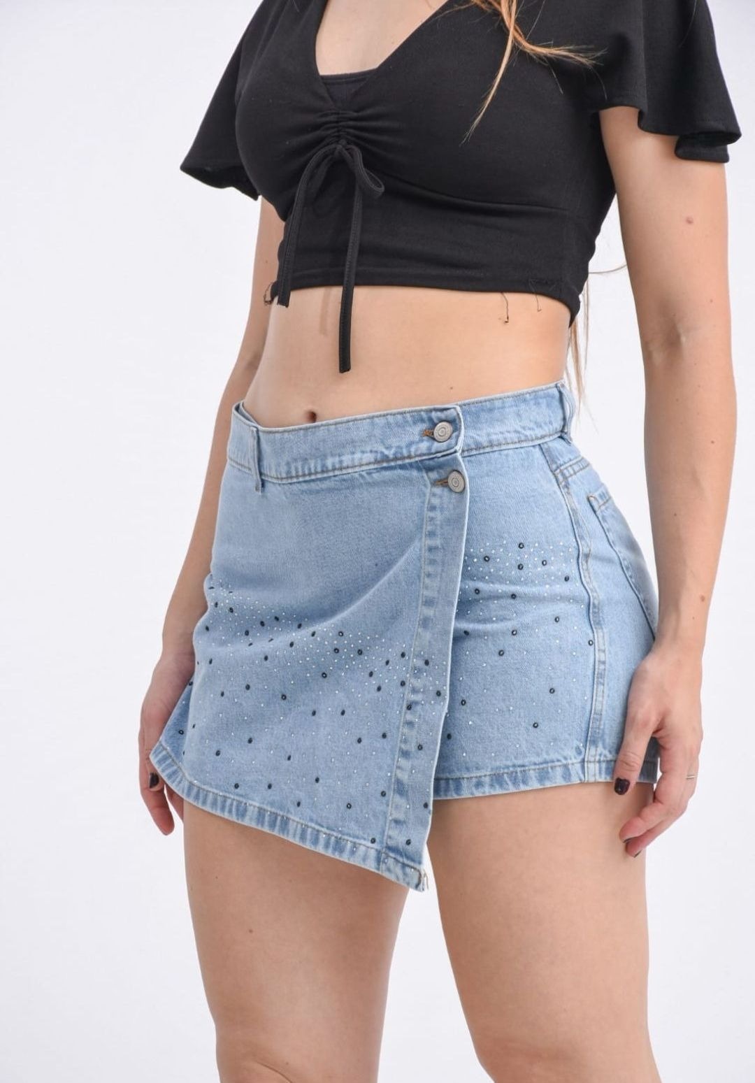 033BR I SHORT POLLERA DE JEAN CON SOLAPA FRONTAL Y STRASS TIRO ALTO TALLES 36 AL 46 EXITO JEANS