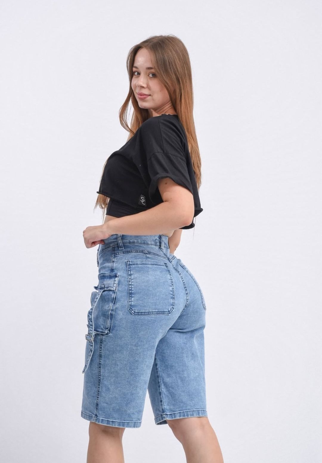 036 I SHORT CARGO DE JEAN AZUL CON AROS METALICOS DESFLECADO TIRO ALTO TALLES 36 AL 40 EXITO JEANS