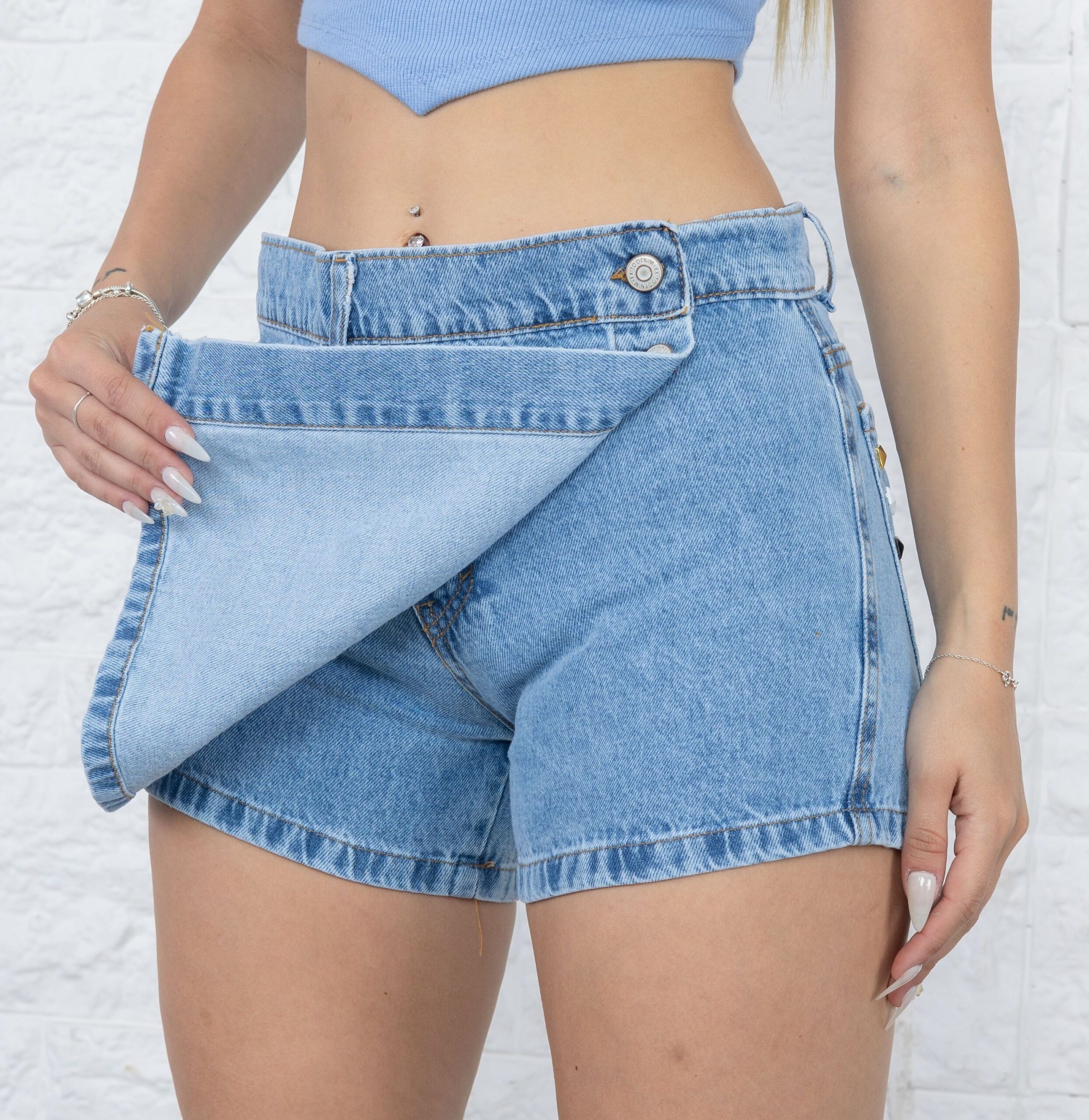 033L I SHORT POLLERA CELESTE RIGIDO CON SOLAPA FRONTAL TIRO ALTO TALLES 36 AL 46 EXITO JEANS