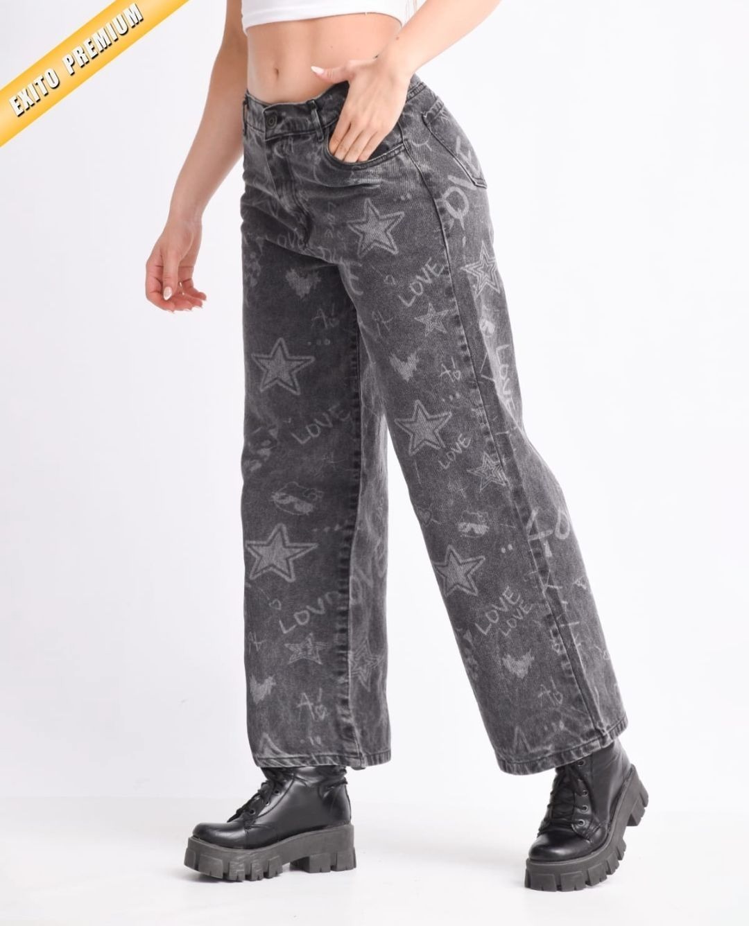 138 | WIDE LEG GRIS DISEÑO LOVE/STARS CON ACABADO LASER TIRO MEDIO TALLES 36 AL 46 EXITO JEANS